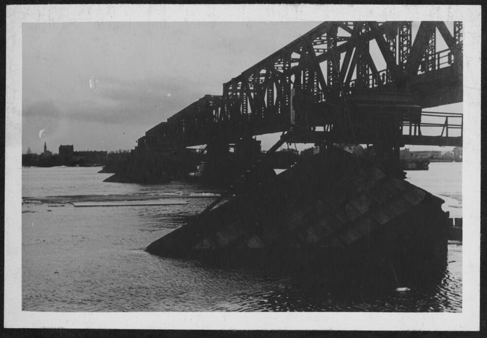 Pagaidu dzelzceļa tilts (pastāvēja no 1945. līdz 1951. gadam) pār Daugavu pēc ledus sanesumu likvidēšanas.