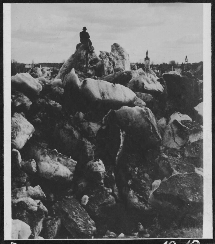 Ledus sastrēgums (10 - 12 metru augstumā) aizsprostojis Daugavas ūdens straumi pie Jaunjelgavas.