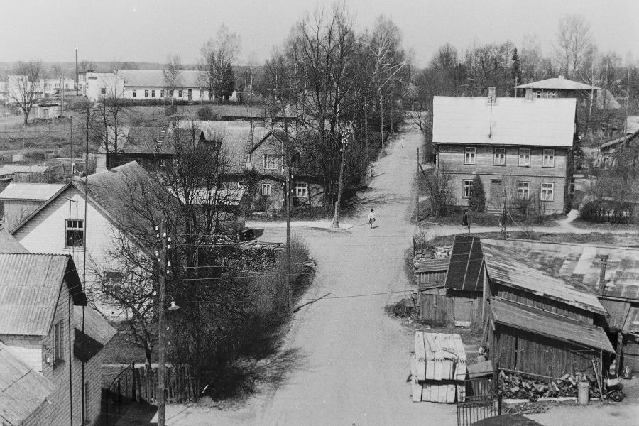 Kronvalda iela krustojumā ar Ā. Alkšņa ielu (padomju laikā Komjaunatnes iela). Tālumā pa kreisi ēka ar skursteni – trikotāžas fabrikas “Māra” Rūjienas filiāle.