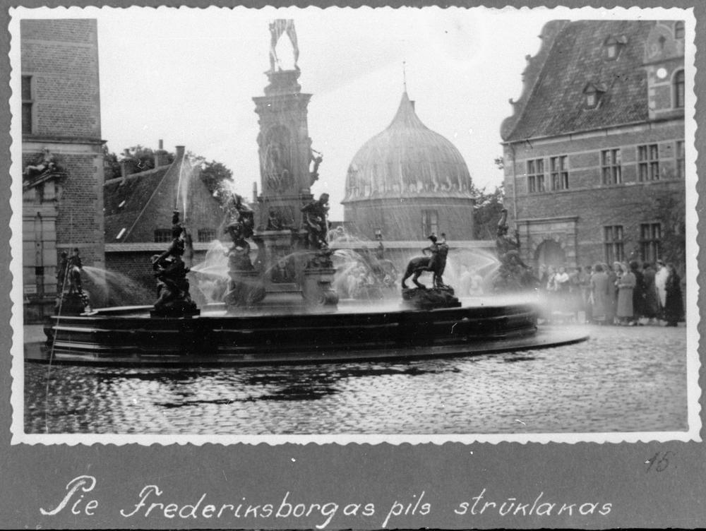 Latvijas Jaunatnes Sarkanā Krusta kora dalībnieki pie Frederiksborgas pils strūklakas Dānijas pilsētā Hilerodā.