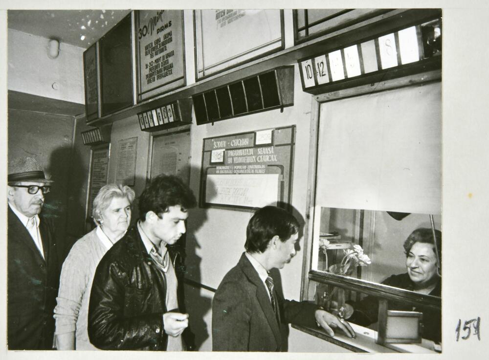 Cilvēki pie kinoteātra "Oktobris" biļešu kasēm.