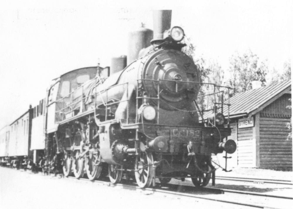 Lokomotīve un vilciens Strenču stacijā ceļā uz nometni Trikatā.