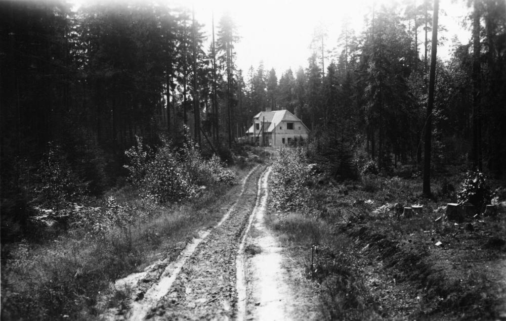 Skats uz Latvijas Republikas robežposteņa ēkas jaunbūvi un meža ceļu.