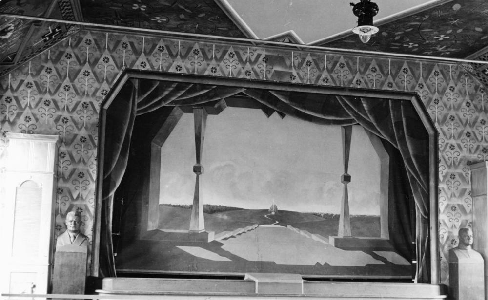 Skats uz Latvijas robežsargu celtā Krivandas Tautas nama skatuves priekškaru.