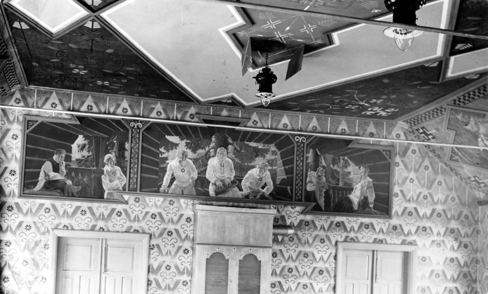 Skats uz Latvijas robežsargu celtā Krivandas Tautas nama sienu un griestu gleznojumiem.