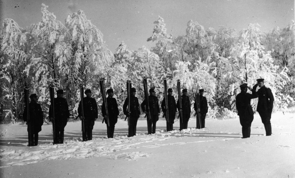Robežsargi ziemā apmācību laikā Latvijas Republikas pierobežas mežā.