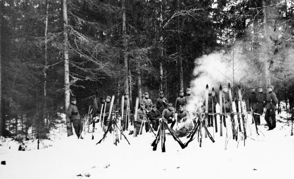 Robežsargi ziemā mācību laikā Latvijas Republikas pierobežas mežā.