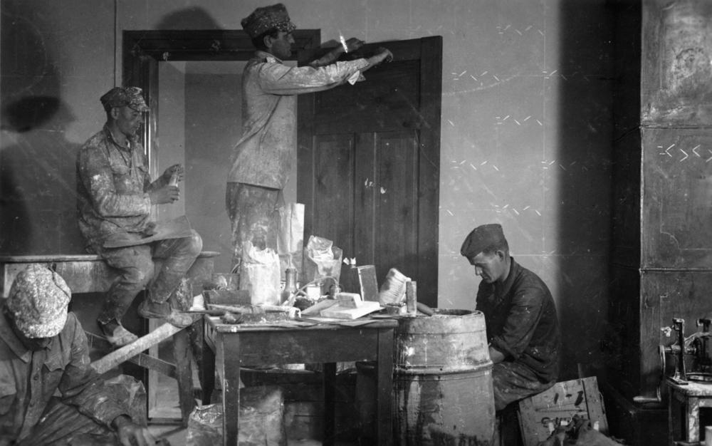 Latvijas Republikas pierobežas joslā robežsargi celtniecības darbu laikā krāso telpu.