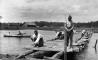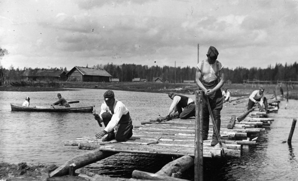 Latvijas Republikas pierobežas joslā robežsargi celtniecības darbu laikā ceļ koka tiltu.