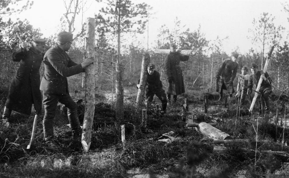 Latvijas Republikas pierobežā robežsargi celtniecības darbu laikā mežā.