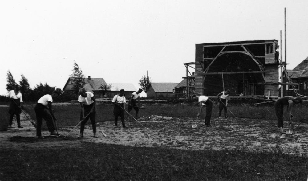 Latvijas Republikas pierobežā skats uz robežsargiem sporta laukuma celtniecības laikā.