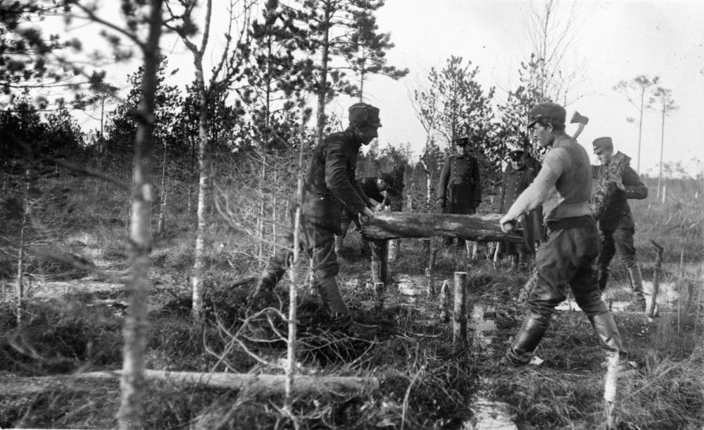 Latvijas Republikas pierobežas joslā robežsargi strādā mežmalā (dzen pāļus?).