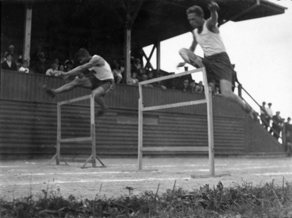 Latvijas Republikas pierobežā robežsargi vieglatlētikas sacensību laikā piedalās barjerskrējienā.