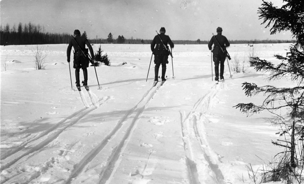 Latvijas Republikas pierobežas sniegotajā laukā slēpo robežsargi.
