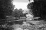Latvijas Republikas pierobežas skats. Tālumā redzamas kādas apdzīvotas vietas ēka un tiltiņš pāri akmeņainai upei.