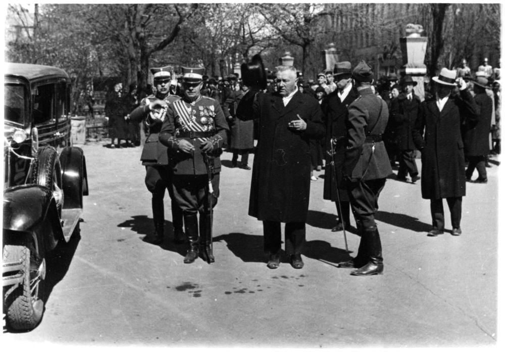 Valdības pārstāvji svētku norises vietā. Priekšplānā stāv no kreisās: 1. Latvijas armijas štāba priekšnieks, ģenerālis Mārtiņš Hartmanis; 2. Latvijas armijas komandieris, ģenerālis Krišjānis Berķis; 3. kara ministrs, ģenerālis Jānis Balodis, 4. iekšlietu viceministrs Alfrēds Jēkabs Bērziņš.