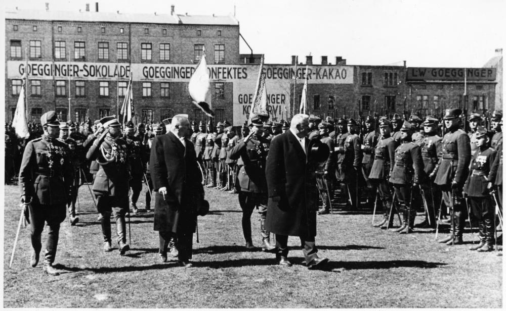 Priekšplānā no kreisās: 1. aizsargu organizācijas priekšnieks, pulkvedis-leitnants Kārlis Prauls; 2. kara ministrs, ģenerālis Jānis Balodis; 3. Ministru prezidents Kārlis Ulmanis "Latvijas Sporta biedrības" laukumā, kur nostājušās aizsargu pulku rotas ar karogiem. Fonā redzamas Ludmilas Gēgingeres dibinātās konservu un konfekšu fabrikas AS "L. W. Goegginger" produktu reklāmas.