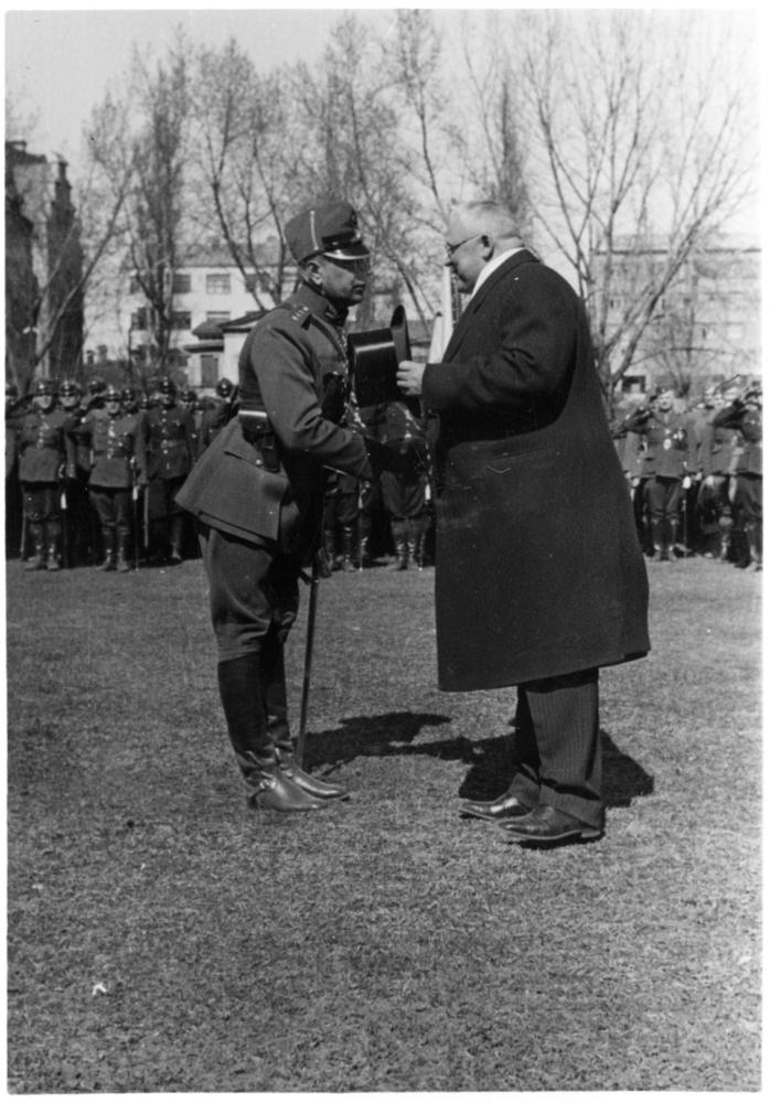 Latvijas Ministru prezidents Kārlis Ulmanis (no labās) svētkiem veltītajā aizsargu pulku rotu skatē sasveicinās ar Aizsargu organizācijas priekšnieku pulkvedi-leitnantu Kārli Praulu (no kreisās).