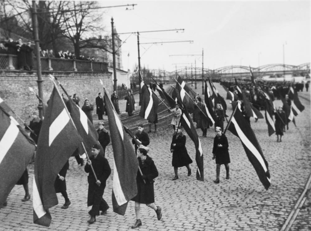 Ministru prezidenta Kārļa Ulmaņa Valsts prezidenta amata pārņemšanas dienā 1936. gada 11. aprīlī pie Rīgas pils pa 11. novembra bulvāri tautas manifestācijā skolēni nes karogus.