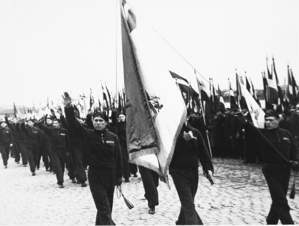 Ministru prezidenta Kārļa Ulmaņa Valsts prezidenta amata pārņemšanas dienā 1936. gada 11. aprīlī Daugavmalā, pa 11. novembra bulvāri iet svinīgās tautas manifestācijas dalībnieki.