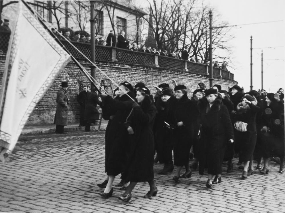 Ministru prezidenta Kārļa Ulmaņa Valsts prezidenta amata pārņemšanas dienā 1936. gada 11. aprīlī pie Rīgas pils pa 11. novembra bulvāri iet svinīgās tautas manifestācijas dalībnieces.