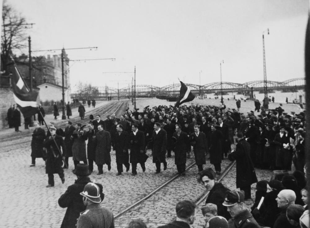 Svinīgās tautas manifestācijas dalībnieku kolonna 11. novembra bulvārī, Daugavmalā pie Rīgas pils Ministru prezidenta Kārļa Ulmaņa Valsts prezidenta amata pārņemšanas dienā 1936. gada 11. aprīlī.