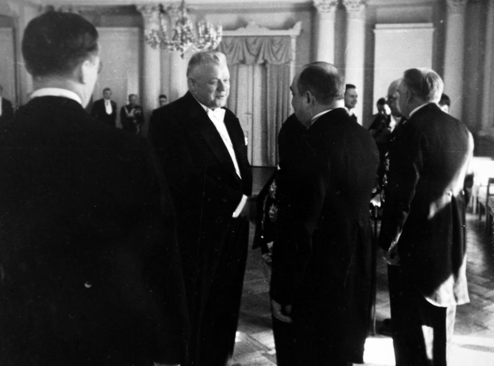 Latvijas Valsts un Ministru prezidents Kārlis Ulmanis (centrā) Rīgas pils Baltajā zālē sasveicinās ar ārvalstu diplomātiskā korpusa pārstāvjiem.