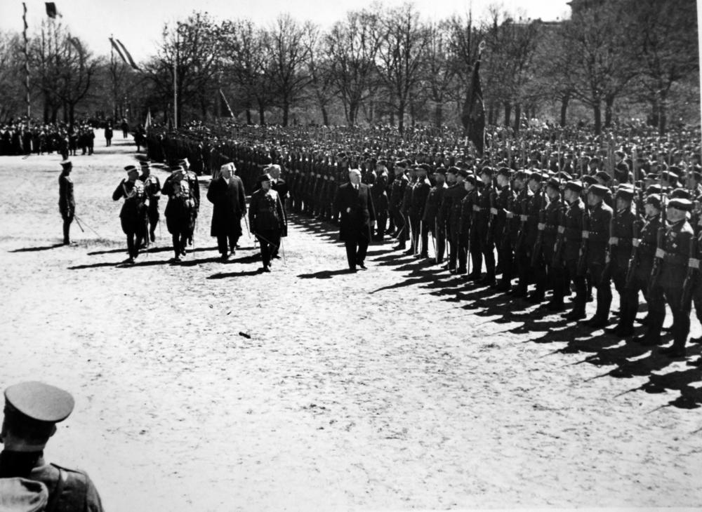 Latvijas Valsts prezidents Alberts Kviesis, Ministru prezidents Kārlis Ulmanis, valdības locekļi un armijas augstākie virsnieki (1935. gada 15. maijā Esplanādē?) apstaigā Latvijas armijas karavīru ierindu.
