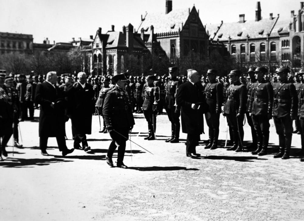 Latvijas armijas parāde 1935. gada 15. maijā (?) Esplanādes laukumā. No kreisās: 1. kara ministrs Jānis Balodis, 2. Ministru prezidents Kārlis Ulmanis, 3. Valsts prezidents Alberts Kviesis.