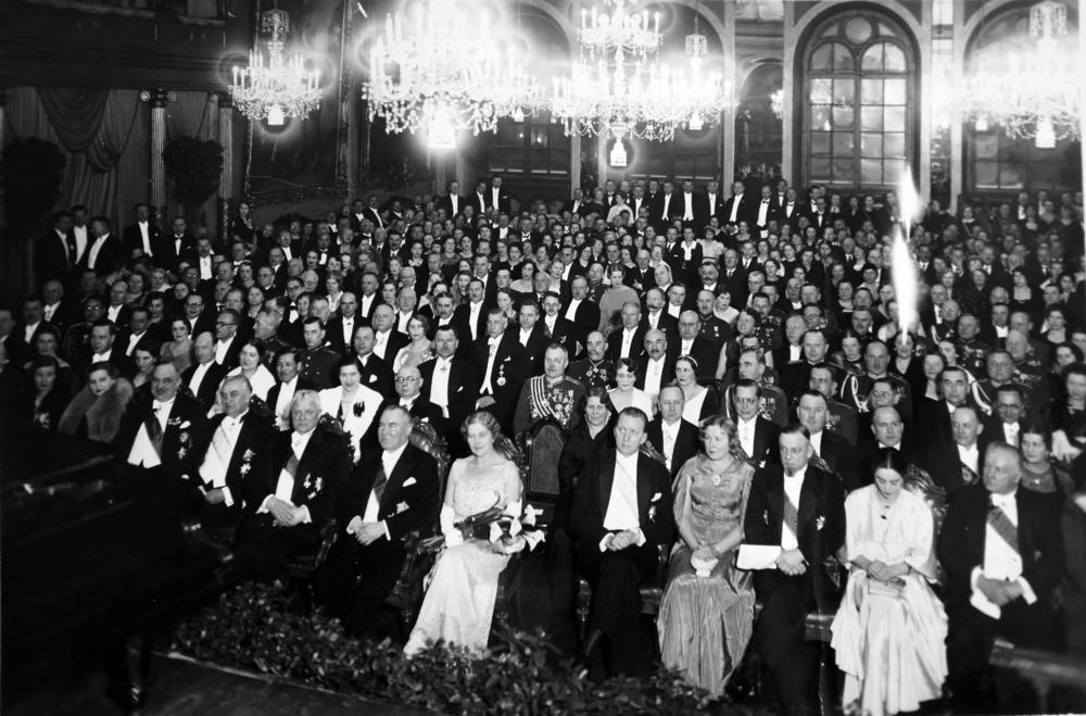 Skats uz svinīgā pasākuma dalībniekiem Melngalvju nama svētku zālē. No labās 1. rindā Latvijas valdības locekļi: 1. Jānis Balodis, 3. Marģers Skujenieks, 7. Valsts prezidents Alberts Kviesis, 8. Ministru prezidents Kārlis Ulmanis. No labās 2. rindā: 5. Vilis Gulbis.