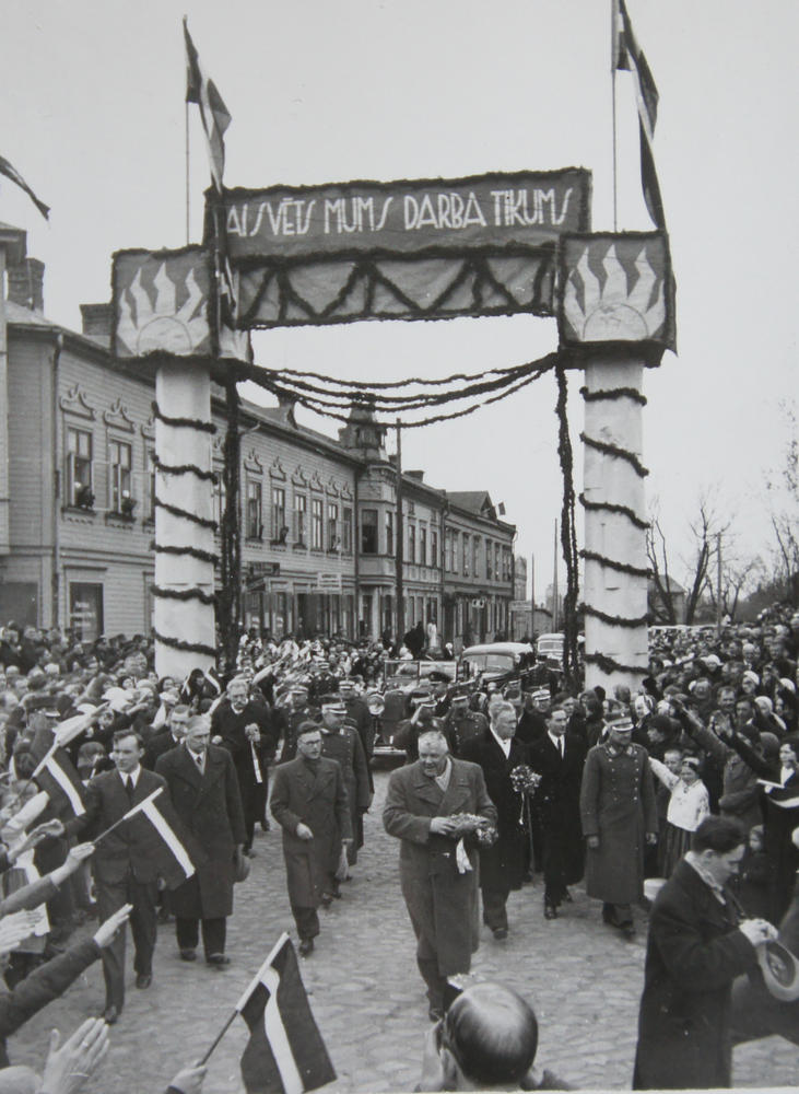 Latvijas Ministru prezidents Kārlis Ulmanis un valdības locekļi izbraukumā kādā Latvijas pilsētā iziet caur goda vārtiem un tiekas ar pilsētniekiem.