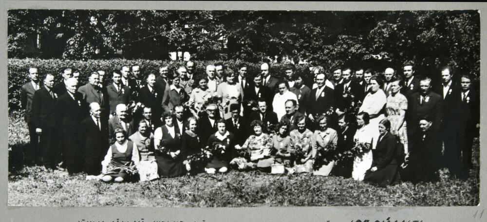 Alūksnes rajona Lauksaimniecības pārvaldes darbinieki pēc apbalvojuma "Par teicamu darbu lauksaimniecībā" saņemšanas. Darbinieku vidū - pārvaldes priekšnieks Valdis Grīnbergs un agronome Lūcija Cīrule. Grupas foto.