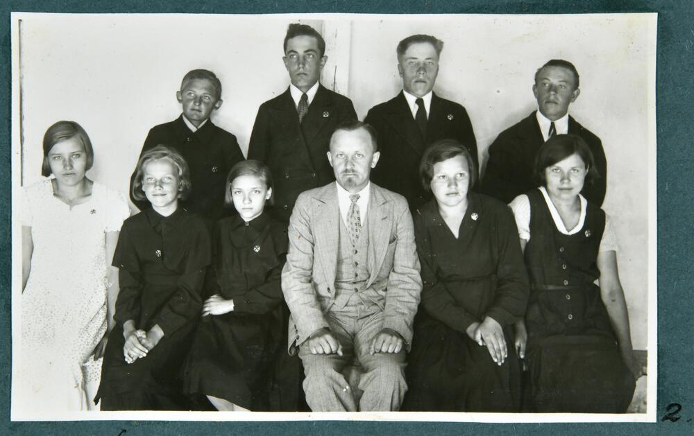 Domopoles (Bērzpils) divgadīgās lauksaimniecības skolas mazpulcēni. 1. rindā no kreisās: 4. skolas pārzinis Jūlijs Zariņš. Grupas foto.