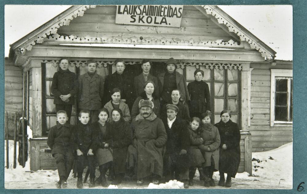 Domopoles (Bērzpils) divgadīgās lauksaimniecības skolas audzēkņi un pasniedzēji pie skolas ēkas ieejas fasādes. Grupas foto