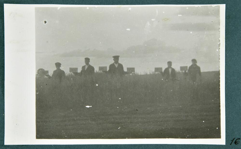 Domopoles (Bērzpils) divgadīgās lauksaimniecības skolas audzēkņi skolas izmēģinājumu laukā pie izaudzētajiem kultūraugiem.
