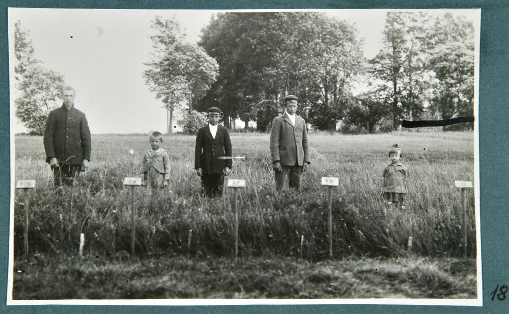 Domopoles (Bērzpils) divgadīgās lauksaimniecības skolas audzēkņi skolas izmēģinājumu laukā pie izaudzētajiem kultūraugiem.