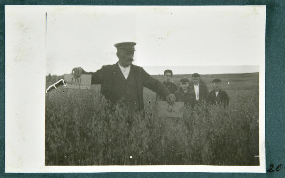 Domopoles (Bērzpils) divgadīgās lauksaimniecības skolas pasniedzējs (priekšplānā) un audzēkņi skolas izmēģinājumu laukā pie izaudzētajiem kultūraugiem.