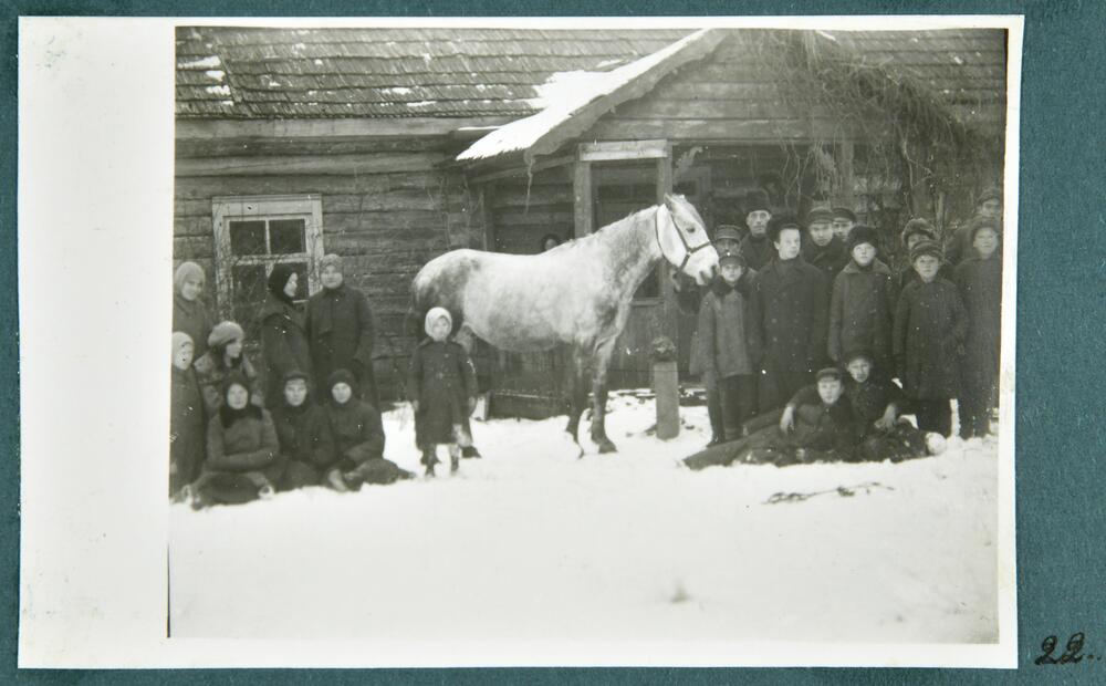 Domopoles (Bērzpils) divgadīgās lauksaimniecības skolas audzēkņi ar zirgu pie skolas ēkas. Grupas foto.