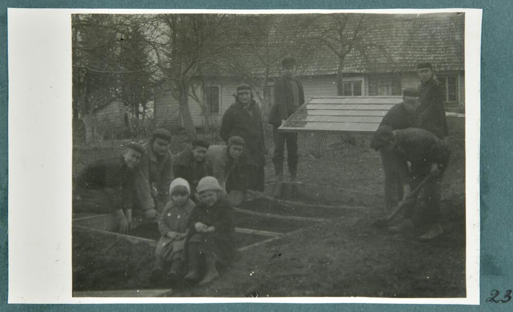 Domopoles (Bērzpils) divgadīgās lauksaimniecības skolas audzēkņi praktiskajās nodarbībās pie skolas ierīko dārza lecekti.