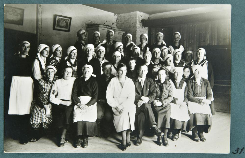 Mājturības kursu dalībnieces un pasniedzēji Domopoles (Bērzpils) divgadīgās lauksaimniecības skolas telpās. 1. rindā no labās: 4. skolas pārzinis Jūlijs Zariņš. Grupas foto.