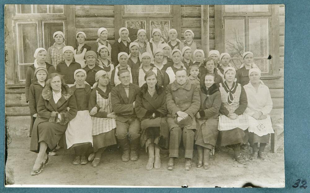 Mājturības kursu dalībnieces un pasniedzēji pie Domopoles (Bērzpils) divgadīgās lauksaimniecības skolas. 1. rindā no labās: 4. skolas pārzinis Jūlijs Zariņš. Grupas foto.