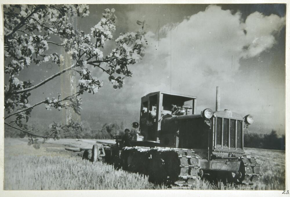 Skats uz kāpurķēžu traktoru ar pļaujmašīnu.