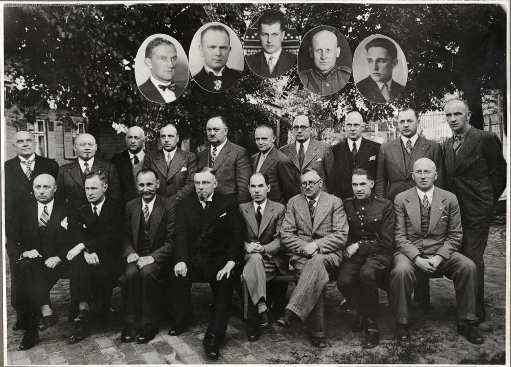 Latvijas Sporta Organizāciju Apvienības (LSOA) valde un Latvijas Olimpiskā Komiteja (LOK). 1. rindā no kreisās: 1. Smagatlētikas savienības priekšsēdētājs, advokāts Alberts Melnbārds, 2. Futbolistu savienības priekšsēdētājs P. Ruiga, 3. LSOA viceprezidents, vieglatlētikas savienības priekšsēdētājs Jānis Druģis, 4. LSOA un LOK prezidents, Ministru prezidenta biedrs Marģers Skujenieks, 5. Riteņbraucēju savienības priekšsēdētājs Jānis Dikmanis, 6. Tenisa savienības priekšsēdētājs, zvērināts advokāts V. Lazdiņš, 7. LSOA sekretārs Fredis Zutis, 8. LSOA kasieris K. Dēze. 2. rindā no kreisās: 1. Motosporta savienības priekšsēdētājs, inženieris J. Legzdiņš, 2. LOK loceklis, fiziskās audzināšanas inspektors Voldemārs Cekuls, 3. LOK loceklis Dr. Emīls Elsbergs, 4. Burātāju savienības priekšsēdētājs, Dr. A. Grīņups, 5. Airētāju savienības priekšsēdētājs V. Veidemanis, 6. Galda tenisa savienības priekšsēdētājs E. Mazenfuss, 7. revīzijas komisijas loceklis A. Rozenblūms, 8. Peldēšanas savienības priekšsēdētājs N. Šargins, 9. LSOA kasiera vietnieks A. Strazdiņš, 10. darbvedis (lietvedis) A. Volfs. Augšā no kreisās: 1. LSOA loceklis R. Treimanis, 2. LOK loceklis, Latvijas kara flotes komandieris Teodors Spāde, 3. LSOA viceprezidents, Basketbola un Ziemas sporta spēļu savienības priekšsēdētājs Roberts Plūme, Šaušanas savienības priekšsēdētājs, pulkvedis Rūdolfs Klinsons, LSOA sekretāra biedrs Nikolajs Kavass. Grupas foto.
