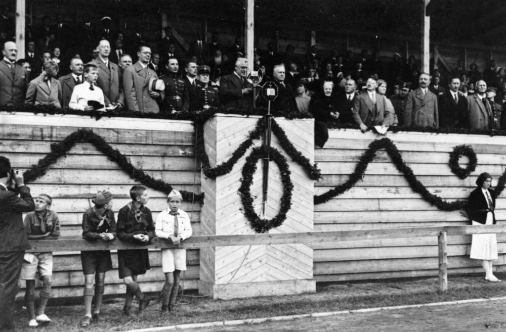Latvijas Republikas Ministru prezidents Kārlis Ulmanis no valdības tribīnēm uzrunā sporta svētku dalībniekus Rīgas pilsētas stadionā (tagad Daugavas stadions). Priekšplānā redzami mazpulku dalībnieki.