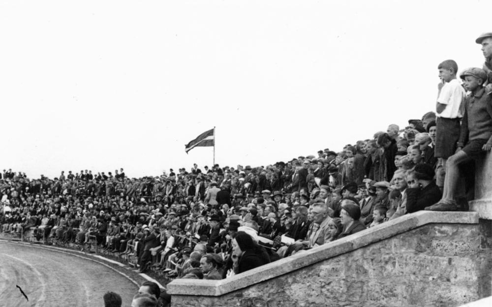 Skats uz Rīgas pilsētas stadiona (tagad Daugavas stadions) skatītāju tribīnēm sporta svētku norises laikā. Fonā plīvojošs Latvijas valsts karogs.