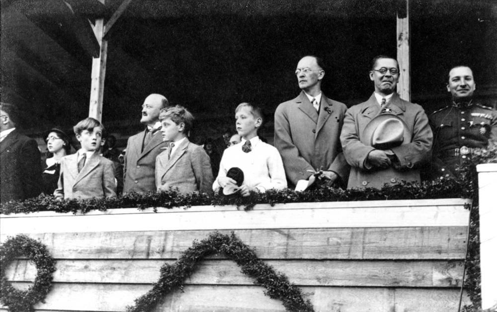 Skats uz valdības locekļu rindām Rīgas pilsētas stadionā (tagad Daugavas stadions) sporta svētku parādes laikā. No kreisās: 1. Latvijas Republikas (LR) ceļu satiksmes ministrs Bernhards Einbergs, 2. LR iekšlietu ministrs Vilis Gulbis, 3. LR iekšlietu ministra vietnieks Alfrēds Bērziņš.