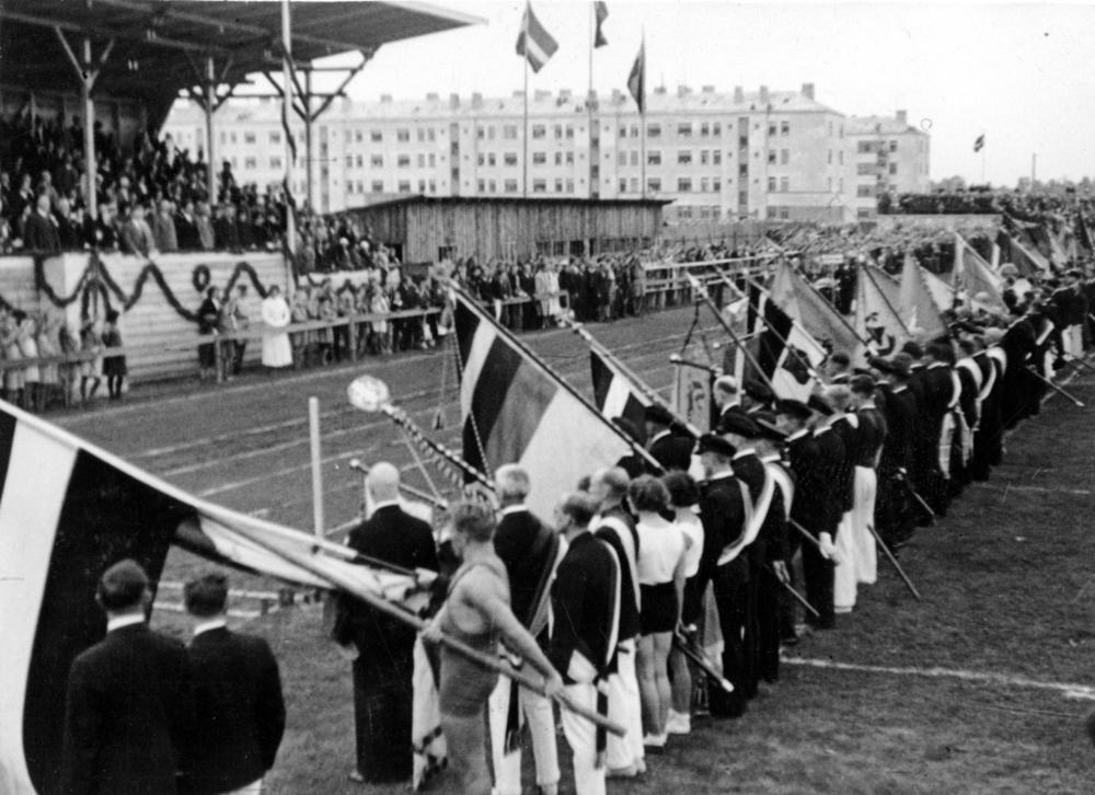 Sporta svētku parādes laikā sportisti, stāvot ierindā, tur rokās Latvijas valsts karogu Rīgas pilsētas stadionā (tagad Daugavas stadions). Citi sportisti tur rokās savas sporta organizācijas karogus. Fonā plīvo Latvijas valsts karogi.