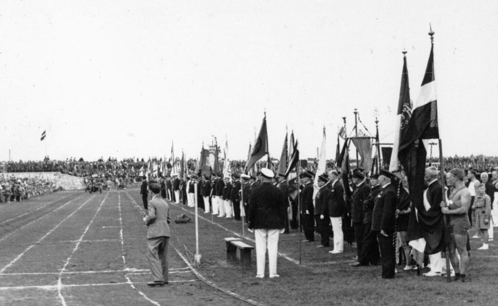 Rīgas pilsētas stadionā (tagad Daugavas stadions) sporta svētku parādes laikā sportistam rokās ir Latvijas valsts karogs un citi sportisti tur savu sporta organizāciju karogus. Fonā plīvo Latvijas valsts karogs.