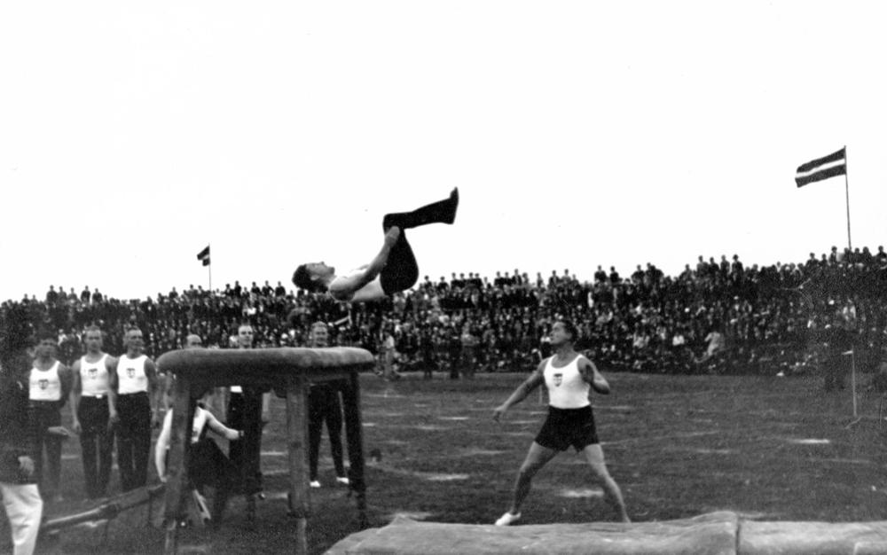 Lēkšana pāri galdam sporta svētku laikā Rīgas pilsētas stadionā (tagad Daugavas stadions). Fonā plīvo Latvijas valsts karogi.