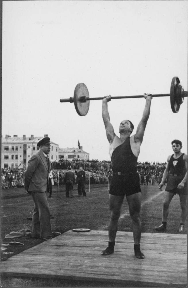 Svarcelšanas sacensības vīriešiem sporta svētkos Rīgas pilsētas stadionā (tagad Daugavas stadions).